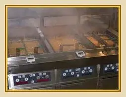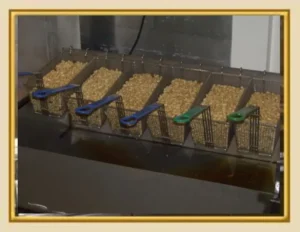 Small baskets drop into boiling peanut oil. Each nut stays surrounded by rich oil longer. You get a deeper roast and a cleaner crunch.